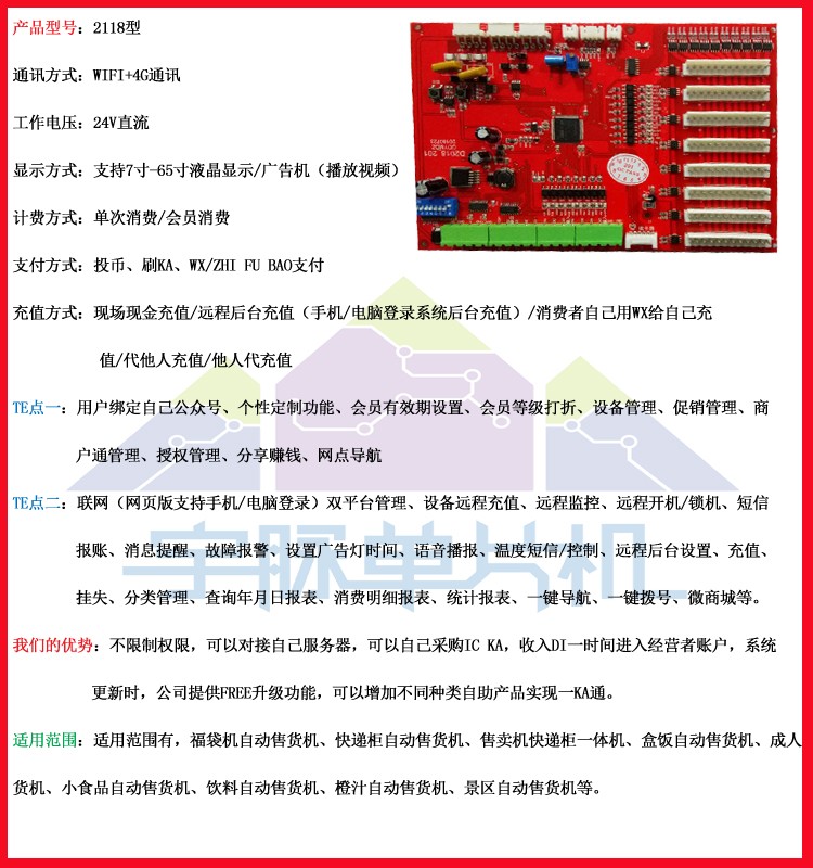 宇脉MCU单片机厂家,主控设备自助研发生产,自助福袋机控制器主板,联网多功能自助设备,支持定制开发,真正拥有自己的研发团队。自助福袋机主控板,小区、商场、厂区自助福袋机、售货机、饮料机,一个主板可以支持80个货道,支持WIFI+4G通讯,自主选择,广告机点击出货,多种支付方式如:刷卡、微信、支付宝等方式,宇脉厂家自主研发的自助系统,系统会不定期的升级, 提供免费升级功能,让您的设备不落后于时代,社会在进步, 我们也在进步。我们坚守着“只有客户好,公司才能发展得更好”的理念,只要您相信我们,我们愿与您共同成就更好的未来,共同成长,共同发展,携手打造一体化智能智慧社区。社区一卡通,让您拥有大数据管理!